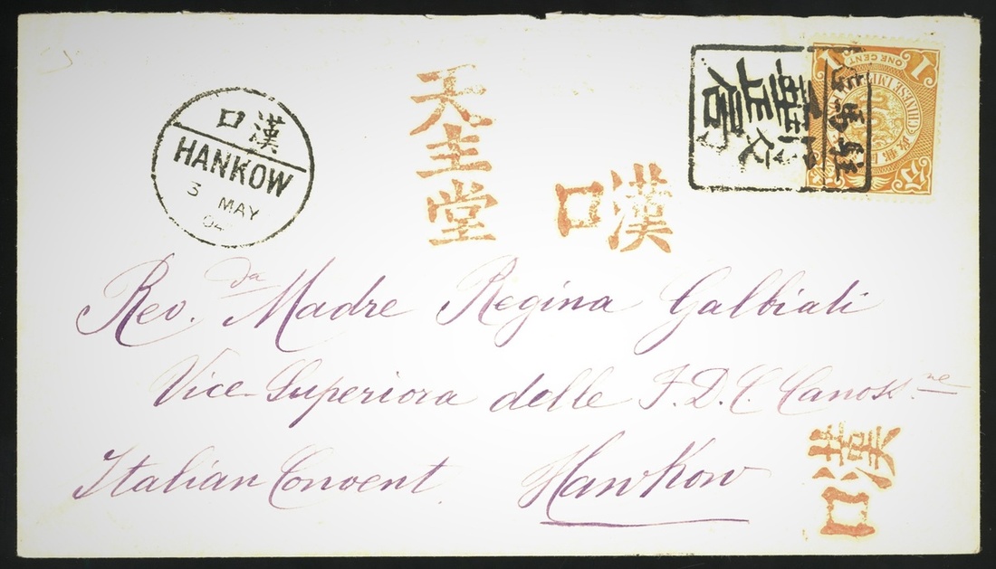 1904 (3 May) an envelope to Hankow 3.5.03, bearing 1c, tied by Zhumadian Tombstone in black, fine.