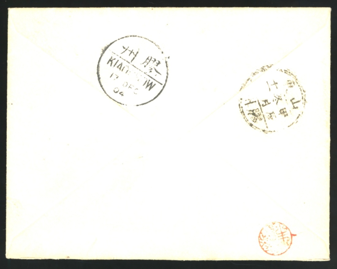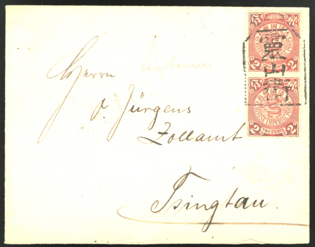1904 (15 Dec.) an envelope to Tsingtau, bearing 2c x 2, tied by Lingshanwei Tombstone in black, Kiaochow 17.12.04 arrival c.d.s. Fine.