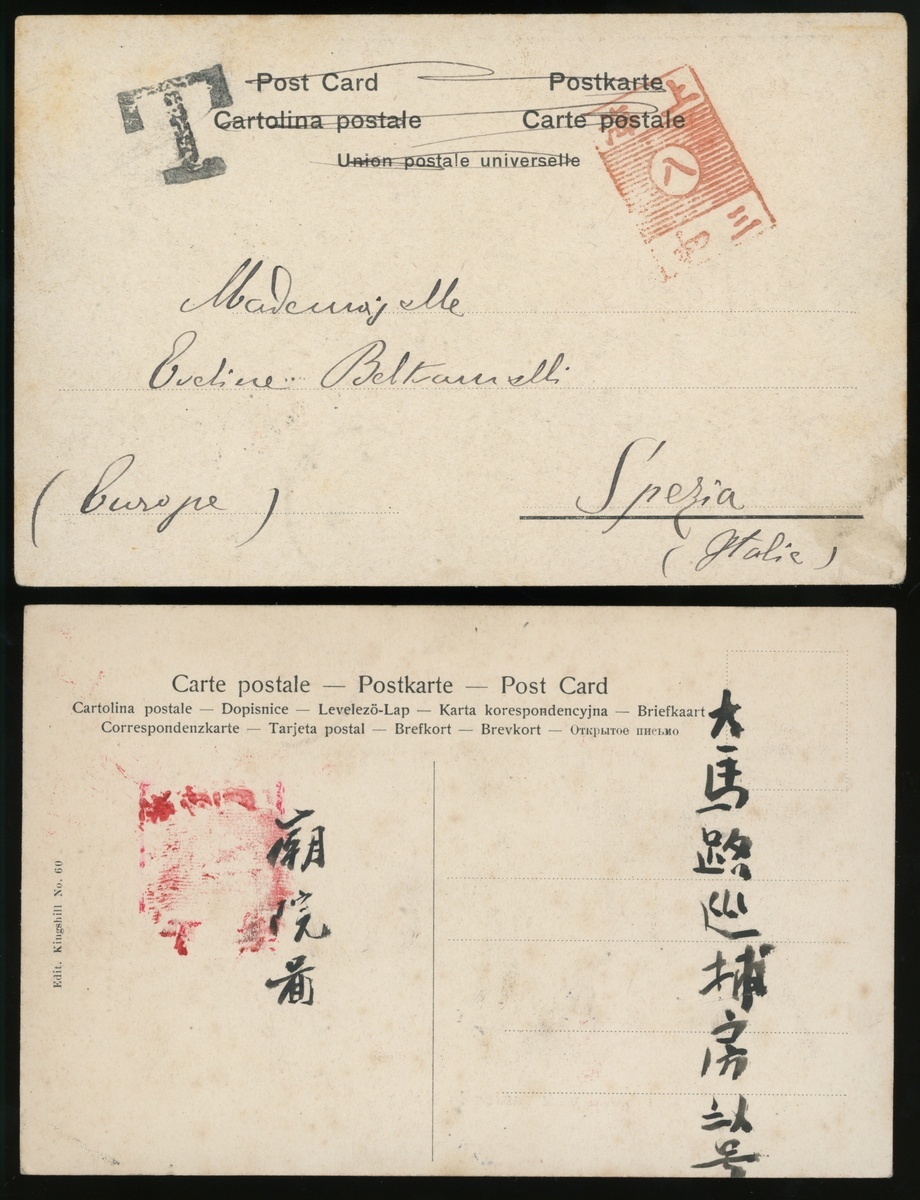 1904 Two pieces of picture cards sent from Shanghai, one with Shanghai No.8 letter box in red and handstamped 'T' postage due mark, another one with Shanghai letter box in red.