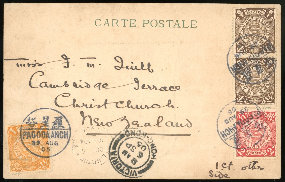 1905年福建羅星塔及新西蘭明信片1件,貼倫敦版蟠龍半分2枚,1分2分各一枚,銷羅星塔8月29日小圓戳,經香港中轉,有香港9月6日戳,及新西蘭10月5日戳,保存完好