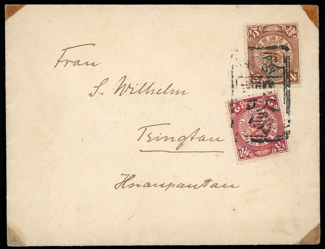 1906 (7 Nov.) envelope to Tsingtau bearing CIP 2c. and 4c. tied by "Kiaochow" tombstone cancellation, on reverse oval c.d.s. in blue.