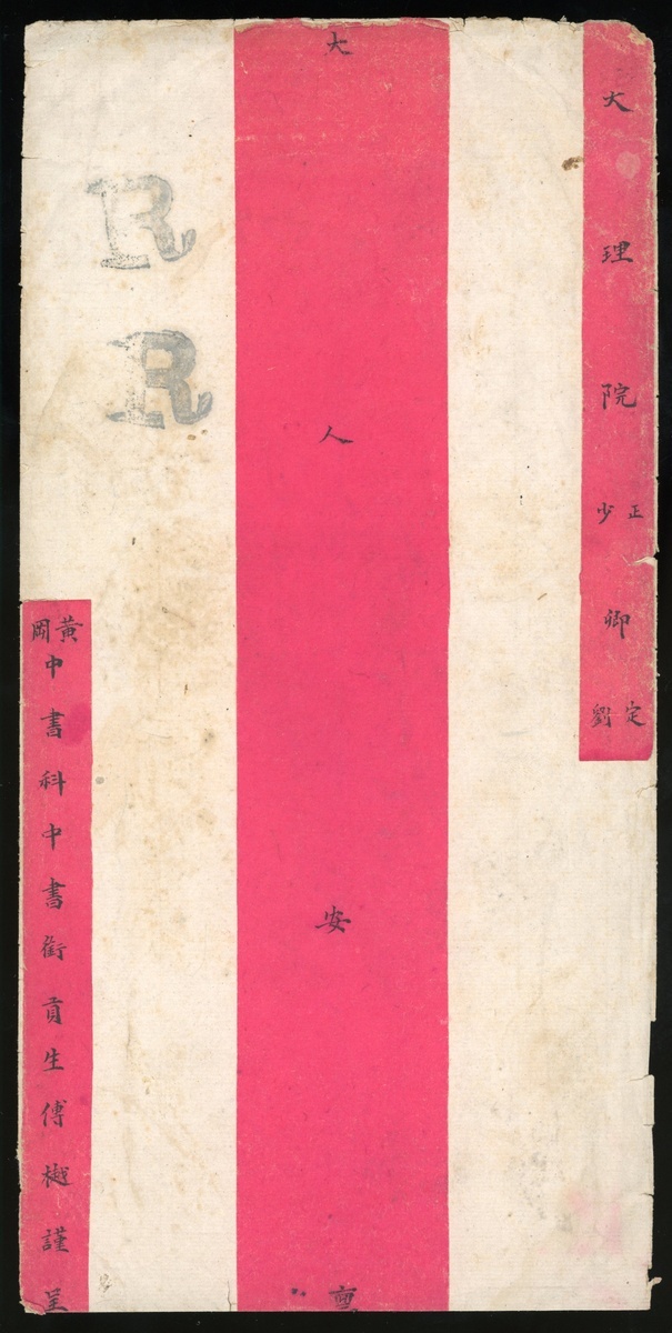 1909年湖北黃岡中書科中書銜貢生呈北京大理寺大型紅條封1件,貼倫敦版蟠龍1分5分10分各一枚,銷湖北團風己酉六月十二日單圈三格干支戳,另蓋湖北團風掛號郵件中文長框戳,及RR戳,郵件封口處蓋吳驗無損章,經漢口中轉有漢口己酉六月十七英漢腰框戳,及北京己酉六月二十一英漢腰框到達戳,保存完好