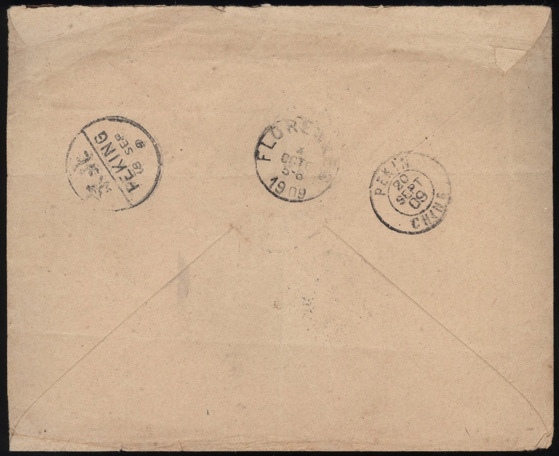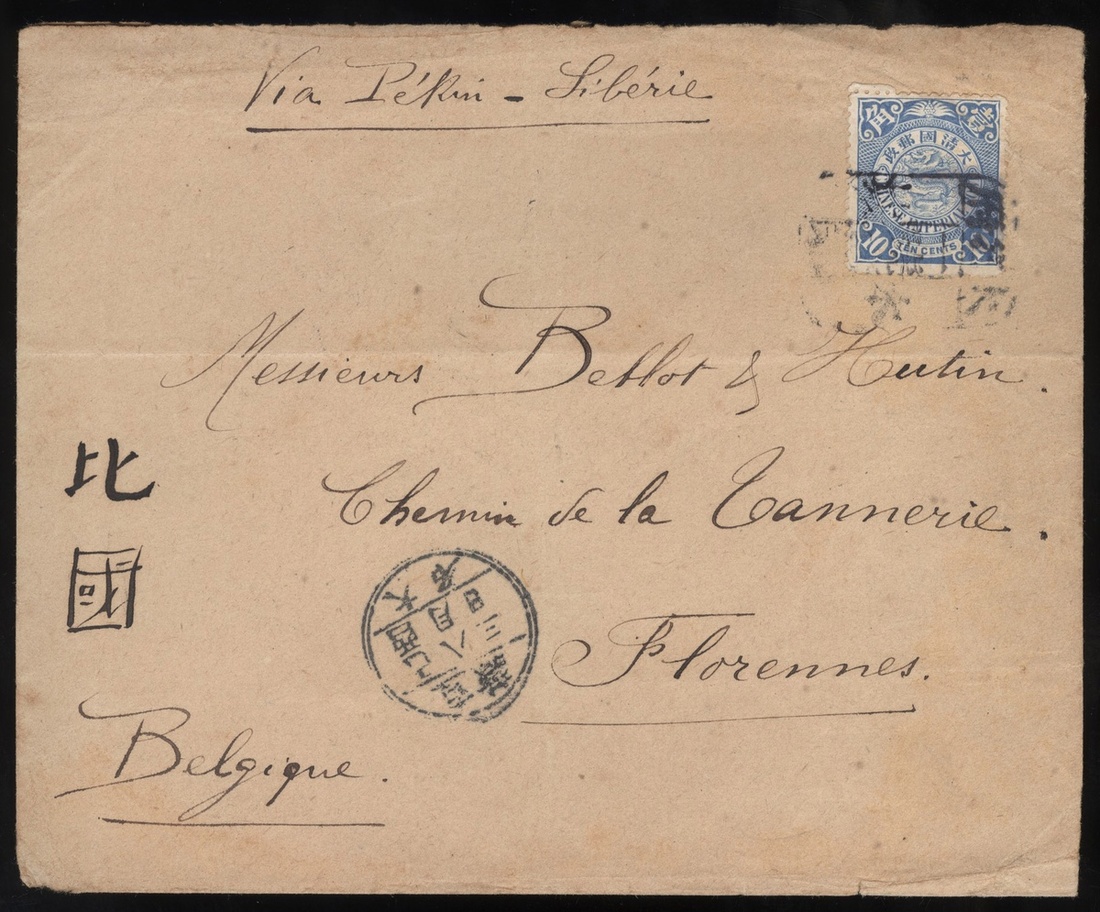 1909 (16 Sep.) An envelope to Belgium bearing C.I.P. 10c. tied by Tamingfu tombstone cancelled, showing lunar date stamp alongside, via Peking(18.9) and Siberia, fine.