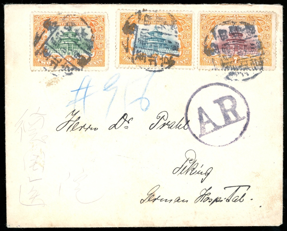 1910 (? Jan) envelope to Peking bearing Hsuen Tung First Year 2c. to 7c. complete set of three cancelled by Tongku to Peking 1st train post office c.d.s., with large circular "AR" h.s. adjacent, showing on reverse Peking arrival c.d.s. (14.1), fine