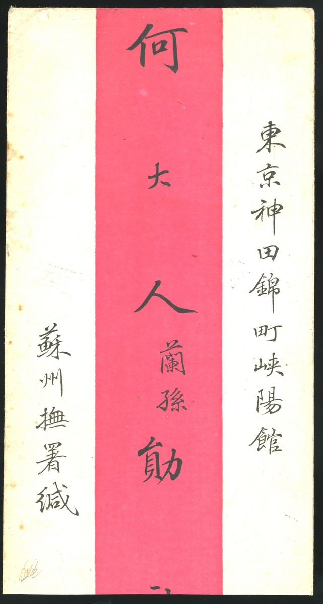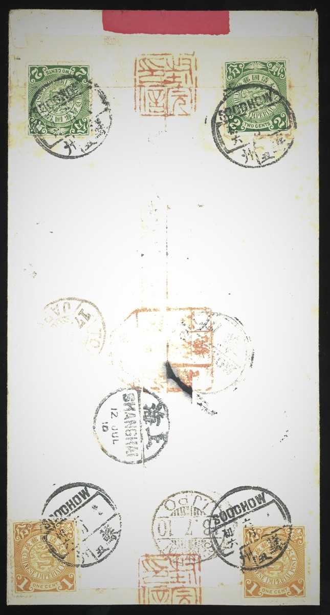 1910 (12 July) a red band envelope to Japan, bearing 1c x 2, 2c x 2, each tied by Soochow c.d.s. with faint letter box in red and Shanghai/IJPO transit, Toyko 27.7.10
