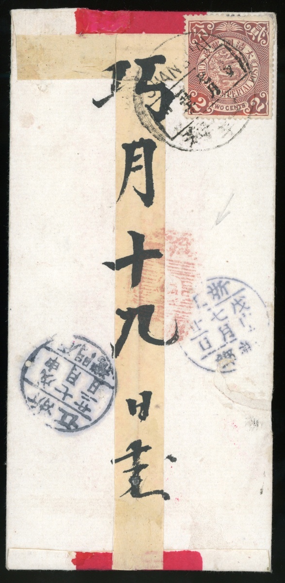 1910 (25 Aug.) a red band envelope to Shanghai locally, bearing 2c, tied by Shanghai Lunar c.d.s. letter box in red alongside, Cheikiang 25.8.10 arrival c.d.s.