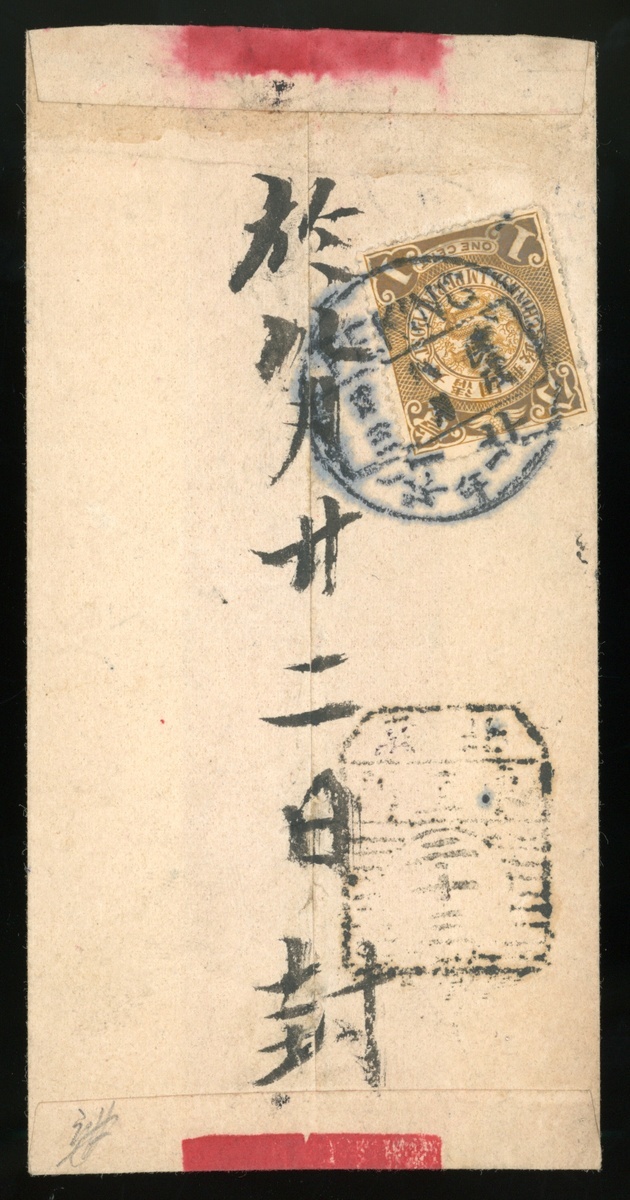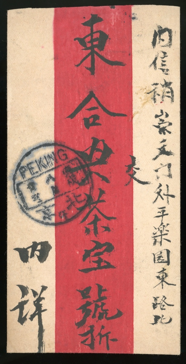 1910 (26 Sept.) a red band envelop to Peking locally, bearing 1c tied by Peking c.d.s. with Peking no. 33 letter box in black.
