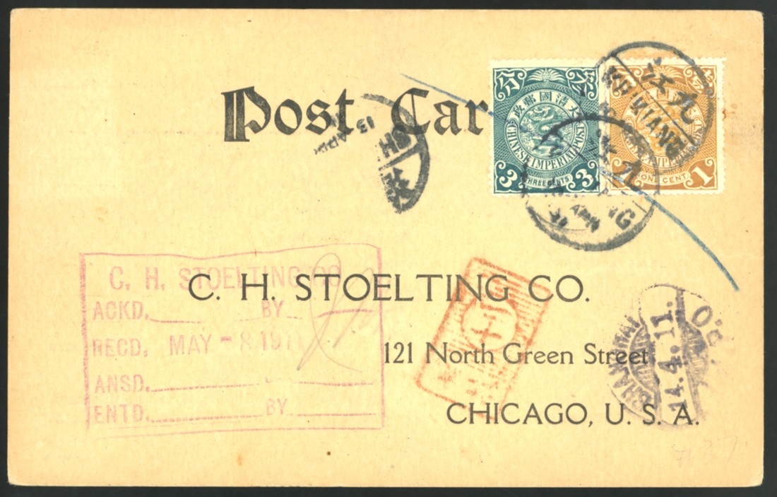 1911 (10 Apr.) a postcard to USA, bearing 1c and 3c, tied by Kiukiang c.d.S. alongside Kiukiang no. 12 letter box in red. Fine.