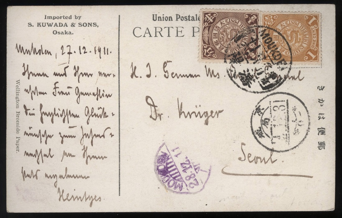 1911 (27 Dec.) picture post card to Seoul, Korea (31.12) bearing C.I.P. ½c. and 1c. cancelled by Moukden lunar c.d.s., showing "Moukden/I.J.P.O." (28.12) transit c.d.s. adjacent and arrival c.d.s., fine.