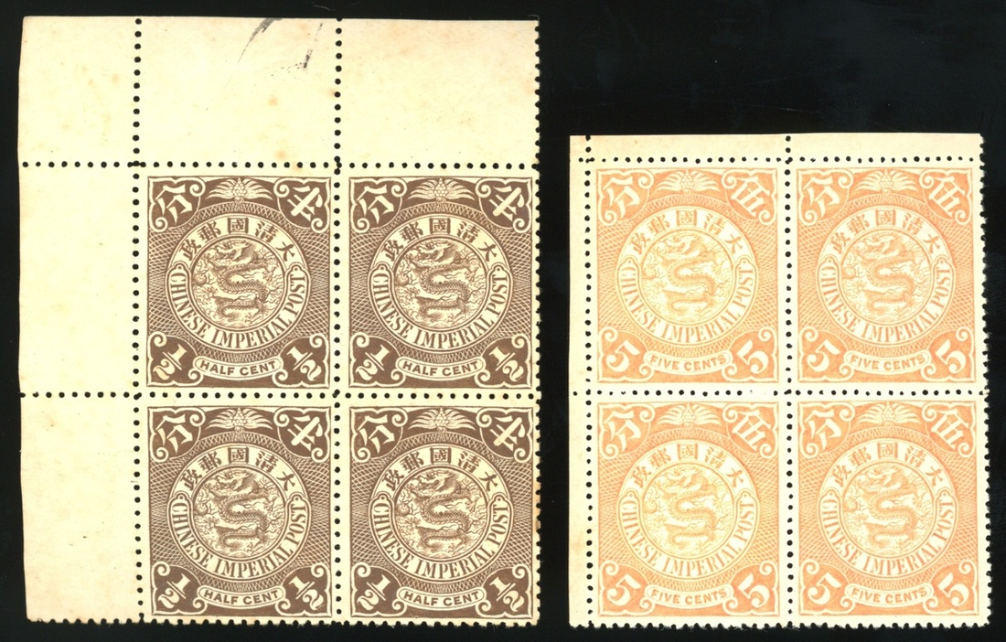 1897-1902年倫敦版有水印蟠龍橙黃5分新票四方連4件,無水印半分新票四方連2件,均帶邊紙,票面顏色鮮豔,齒孔完整,原膠,上中品