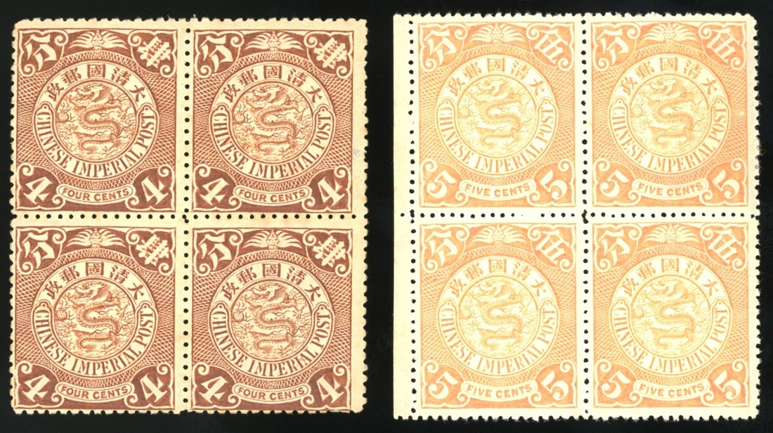 1902年倫敦版無水印蟠龍半分,1分,綠2分,3分,棕4分,橙黃5分新票四方連各一件,票面顏色鮮豔,齒孔完整,均原膠無貼,個別背膠微黃,整體上中品