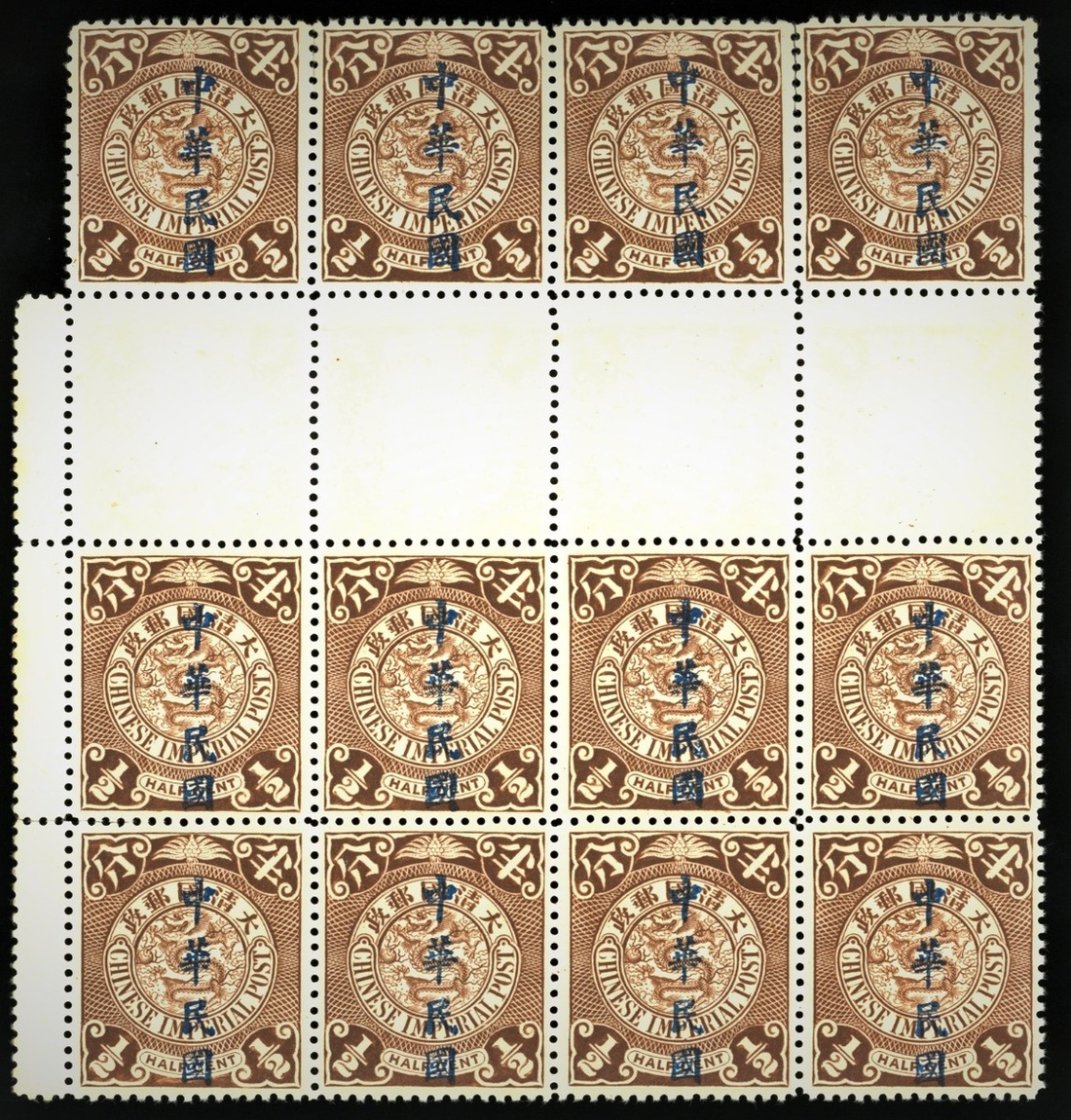 1912年倫敦版蟠龍半分加蓋楷體中華民國新票12方連1件,帶中間過橋,及左邊過橋,票面顏色鮮豔,齒孔完整,原膠,背膠潤亮,品相佳