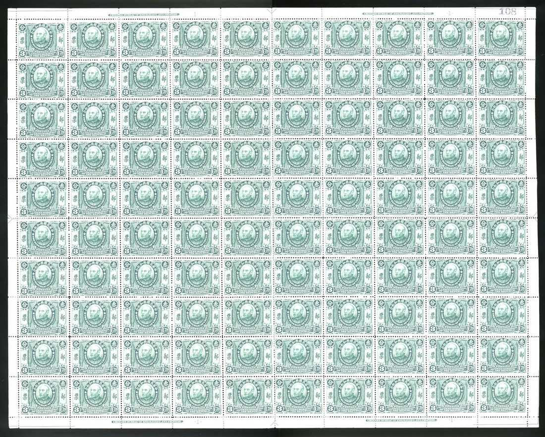 1912年共和紀念3分新票100枚全張1件,票面顏色鮮豔,邊紙完整,原膠,上中品,少見