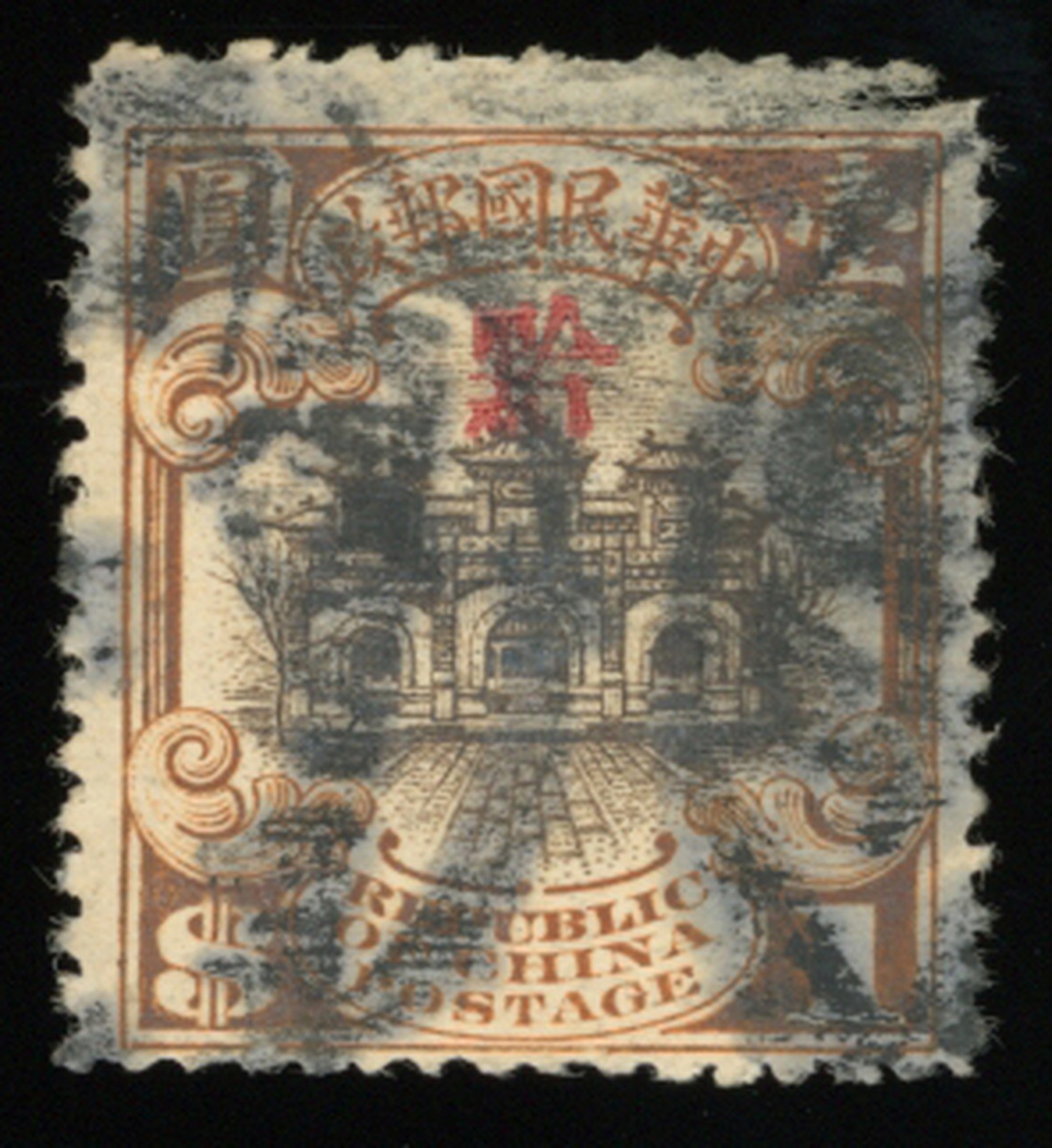 1923 Hall of Classic Issue of The Second Peking Print overprinted "Chien" $1 sepia & brown orange, used, bottom thin. Chan KC1