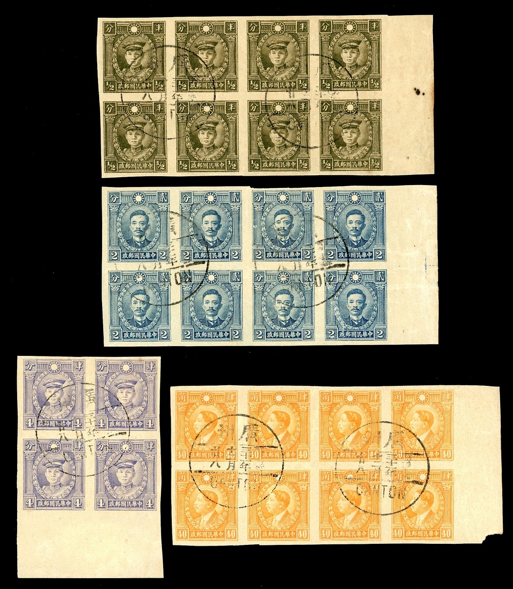1940年香港商務版烈士像無齒票一組,包括半分八方連,2分八方連,4分四方連,40分八方連各一件,均帶邊紙,原膠,銷廣州42年12月28日戳,保存完好