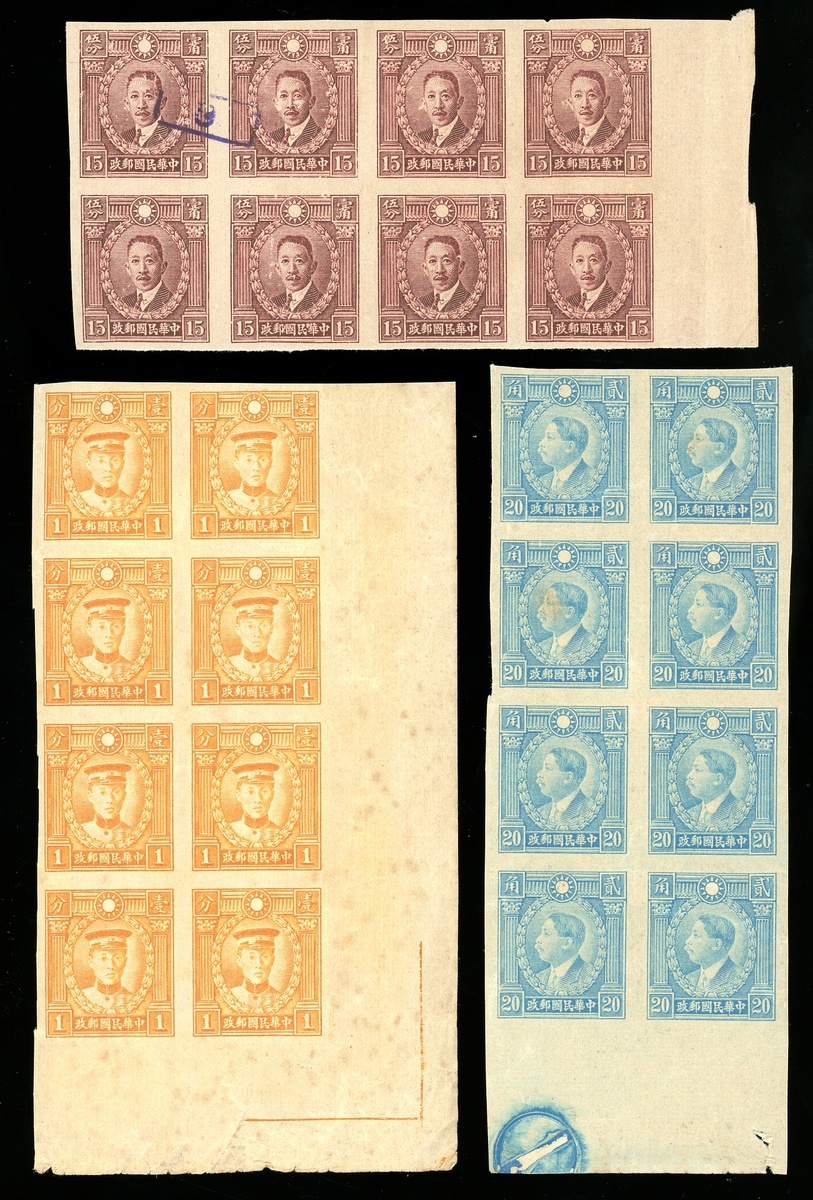 1939 HK print Martyrs no watermark, 1c, 15c and 20c all imperf. in block of 8, unused.