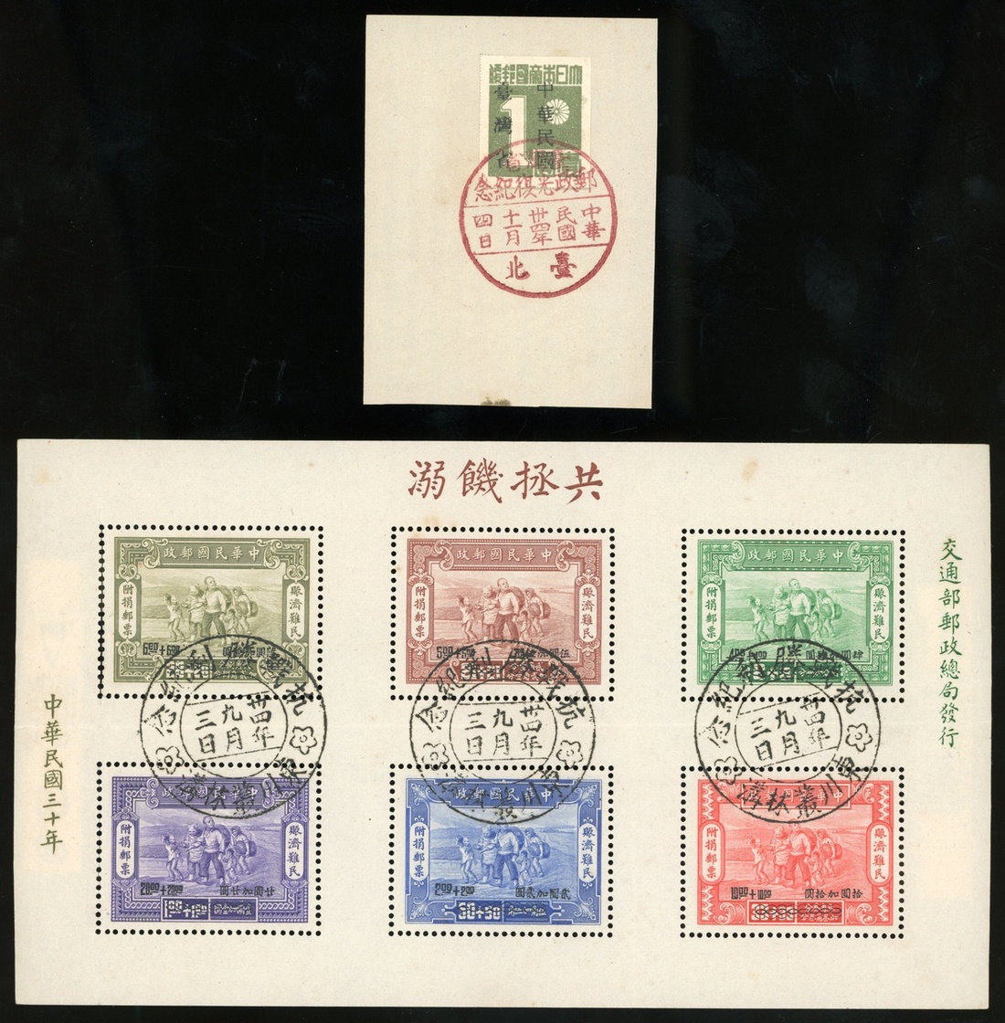 1944年賑濟難民附捐郵票小全張舊票3枚,分別均銷東川業林溝45年9月3日抗戰勝利紀念日戳,重慶44年10月10日日戳,重慶44年10月10日國防科學展覽紀念戳,另由台灣日本郵票加蓋中華民國台灣省1元剪片1枚,銷台灣省郵政光復紀念戳,整體保存完好
