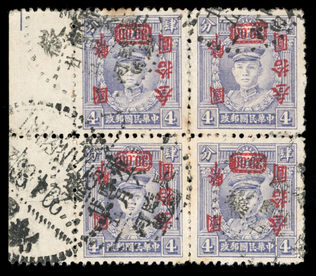 1946年港版烈士4分重慶大東加蓋國幣30元舊票四方連1件,帶左邊紙,加蓋倒蓋變體,銷安徽長臨河47年4月25日戳,及上海4月29日戳,票面顏色鮮豔,字模清晰,上中品,此票倒蓋變體舊票少見