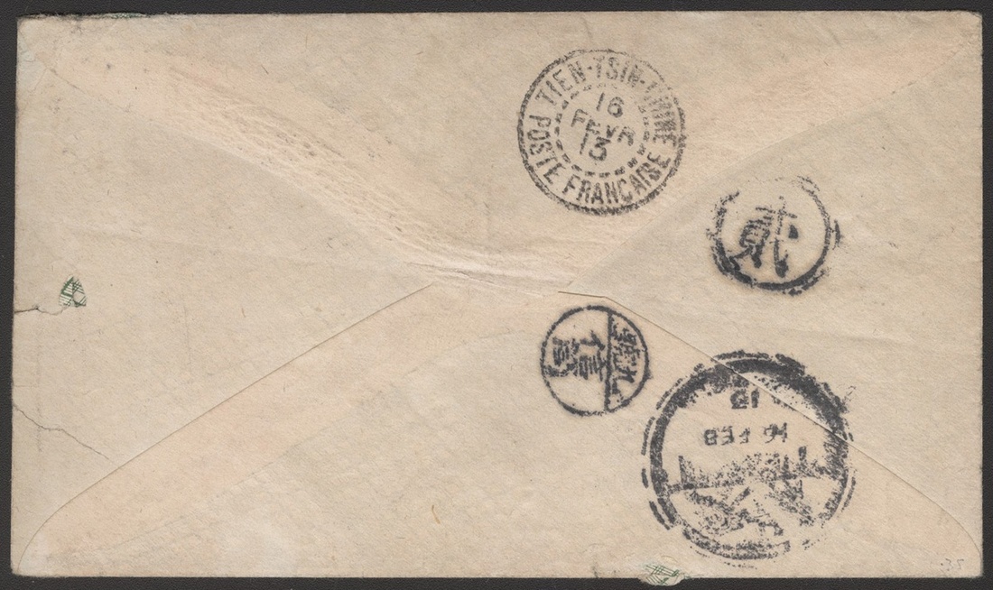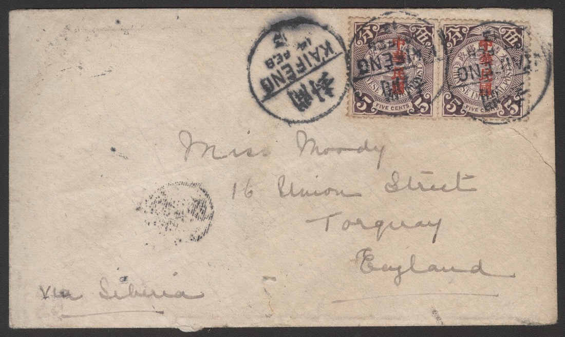 1913 (14 Feb.) An envelope to England bearing C.I.P. 5c. pair tied by Kaifeng bilingual c.d.s., on reverse, showing letter box No.9, via Tientsin(16.2) c.d.s., fine.