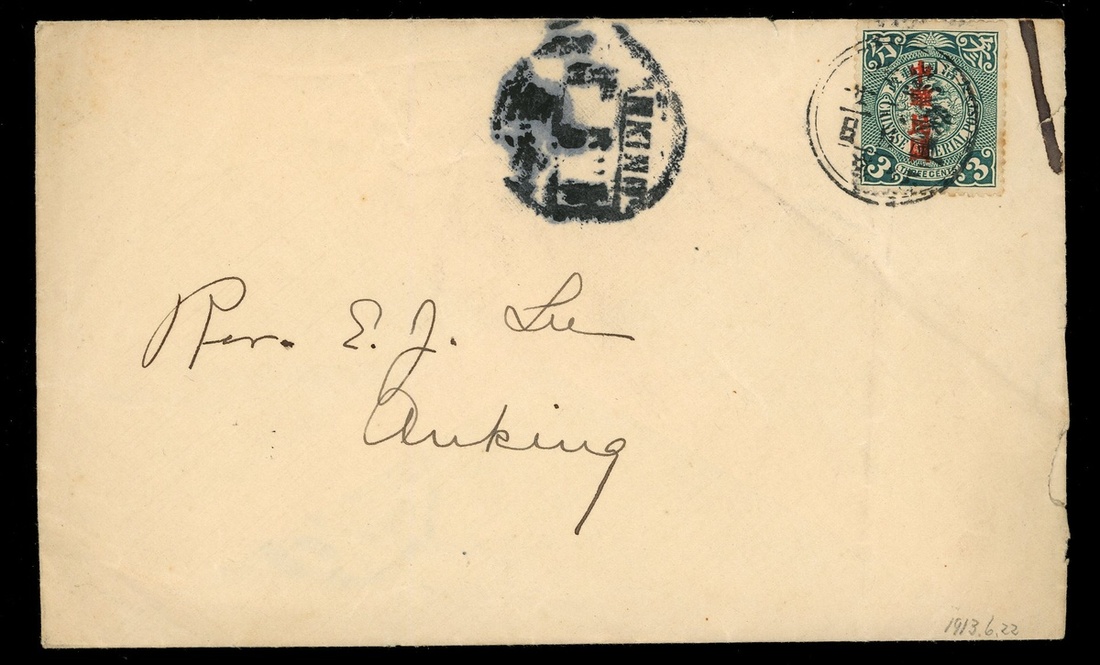 Lunar Datestamp: Kuling: 1913 (21 Jun.) envelope to Anking bearing overprinted Republic of China Coiling Dragon 3c. tied by Kuling 'Kwai Mou' lunar year c.d.s., via Kuikiang and Anking (6.24) arrival c.d.s. Photo