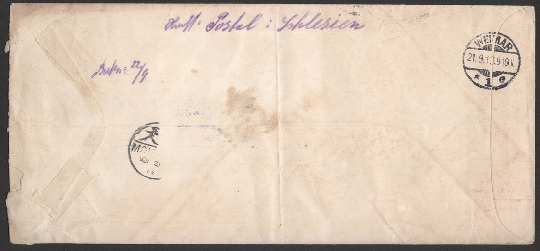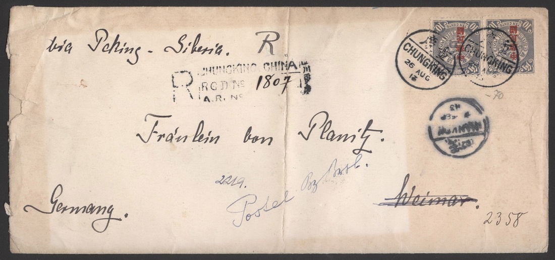 1913 (26 Aug) A registered envelope to Germany bearing C.I.P. overprinted 10c. pair tied by Chungking bilingual c.d.s., showing registered h/s alongside, via Hankow(4,9), Mouken(10.9) and Germany(21.9) arrival c.d.s., cover center folded.
