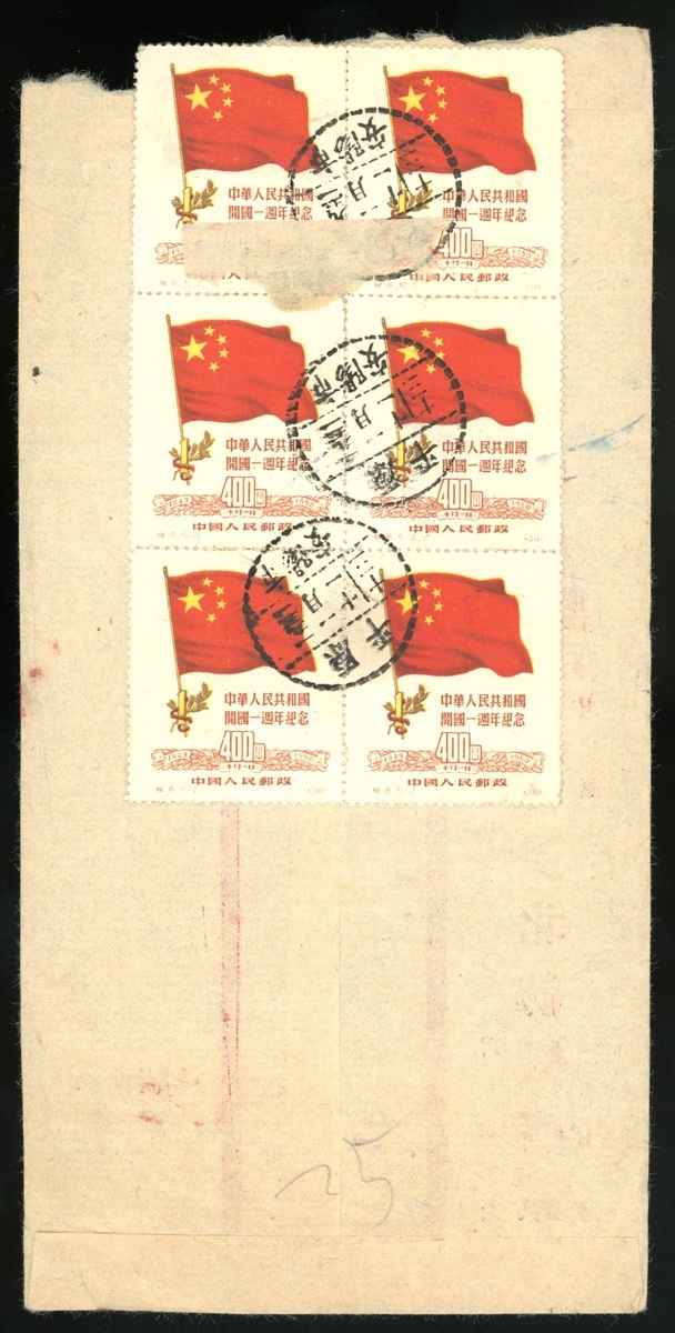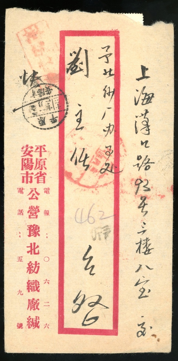 1951年安陽市寄上海快信封1件,貼紀6.400元六方連,銷平原安陽市1月11日戳,封背由快信殘條,由上海14日到達戳,郵戳清晰,保存完好,平原撤銷省份戳少見