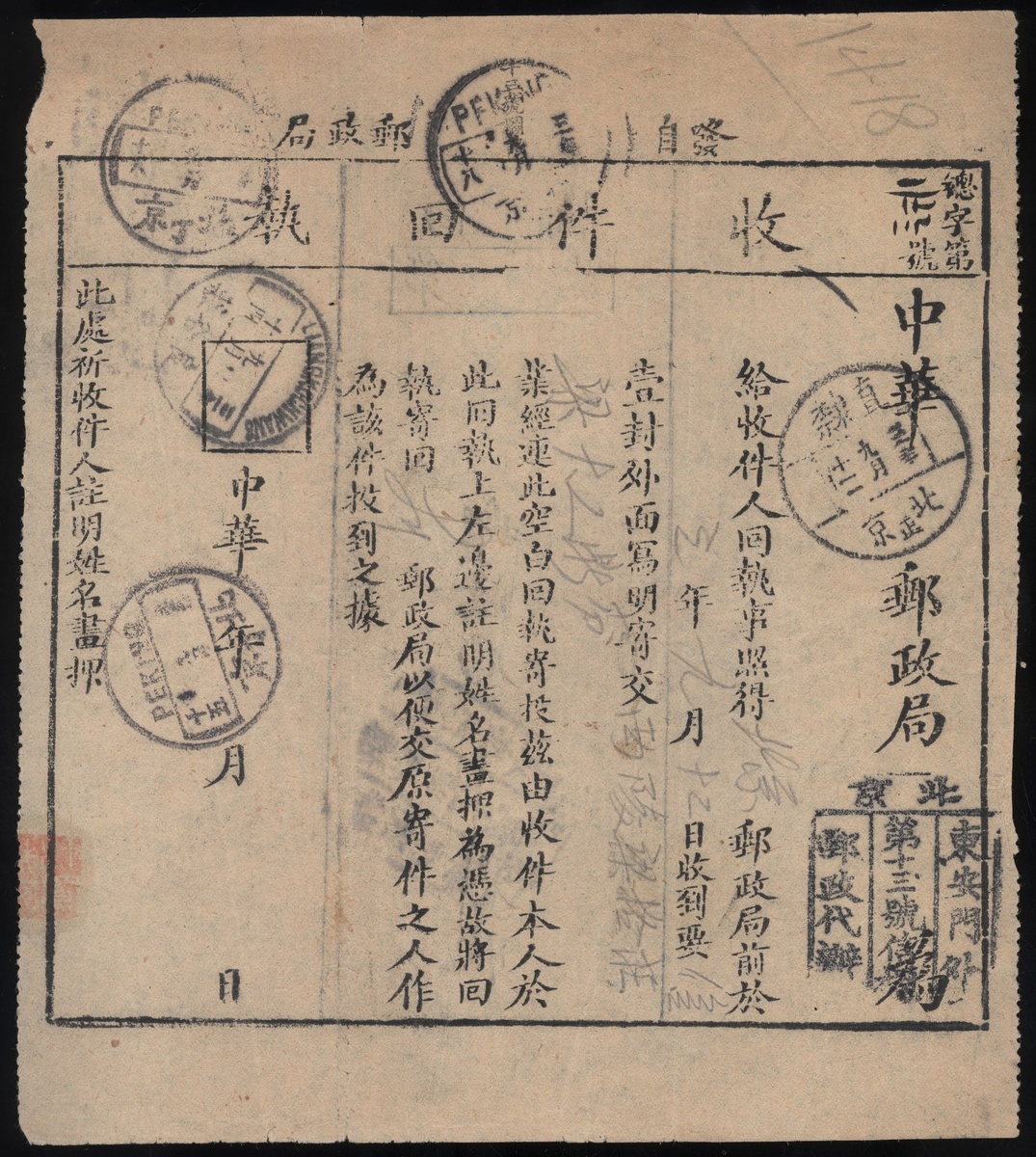 1914 (12 Sep.) A registered receipt of letter box agent, cancelled Peking No.13 tombstone handstamp, and Peking c.d.s., Liangkochwang(14.9) arrival c.d.s., remain complete three portions are very scarce, very fine.