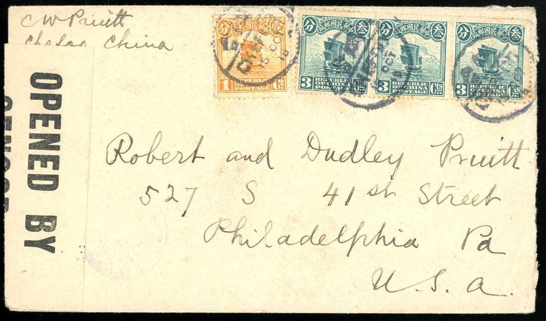 1918 (15 Oct.) envelope to U.S.A. bearing Junk 1c. and 3c. (3) tied by Chefoo bilingual c.d.s., sealed with censor tape, fine.