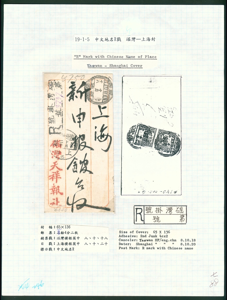1919年江蘇磘灣寄上海中式掛號封1件,貼北京一版帆船4分2枚,銷磘灣10月18日英漢腰框戳,另蓋磘灣掛號長框戳,有上海20日到達戳,置於研究貼片之上,保存完好,為張凱升先生《中國郵戳史》之原件