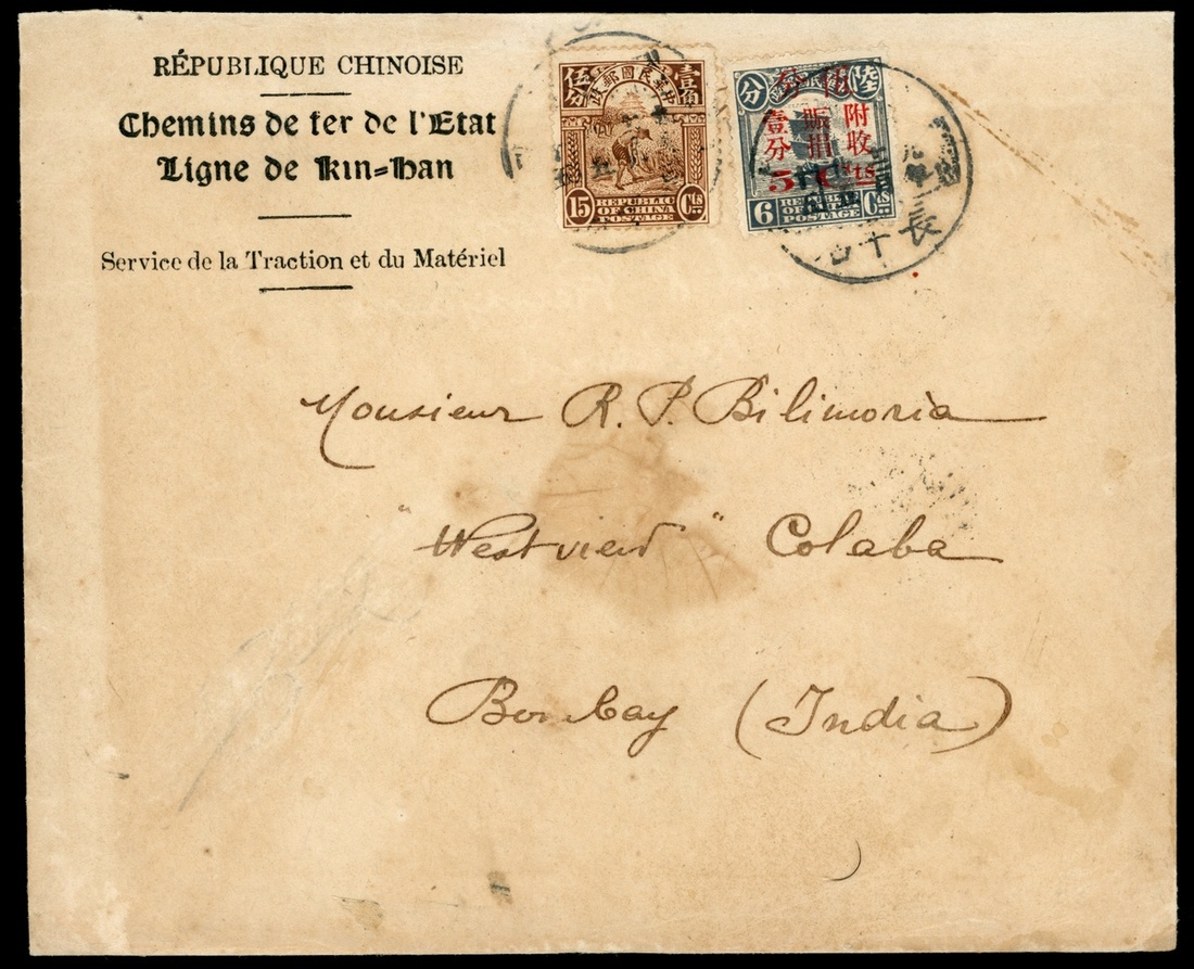 1920年長辛店及印度實寄封1件,貼北京一版農獲15分1枚,帆船加蓋附收賑捐5分1枚,銷長辛店12月25日英漢腰框戳,經北京上海中轉,有北京25日小圓戳,上海28日小圓戳,及印度次年1月18日到達戳,保存完好