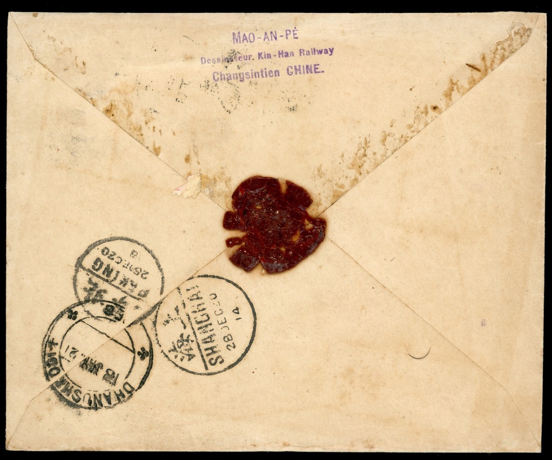 1920 (25 Dec.) envelope to India bearing Famine Relief Surch. 5c, and Junk 15c. cancelled by Changsintien bilingual c.d.s., showing on reverse Peking (25.12) and Shanghai (28.12) transit c.d.s., with next year arrival c.d.s. (18.1.21) adjacent, fine.