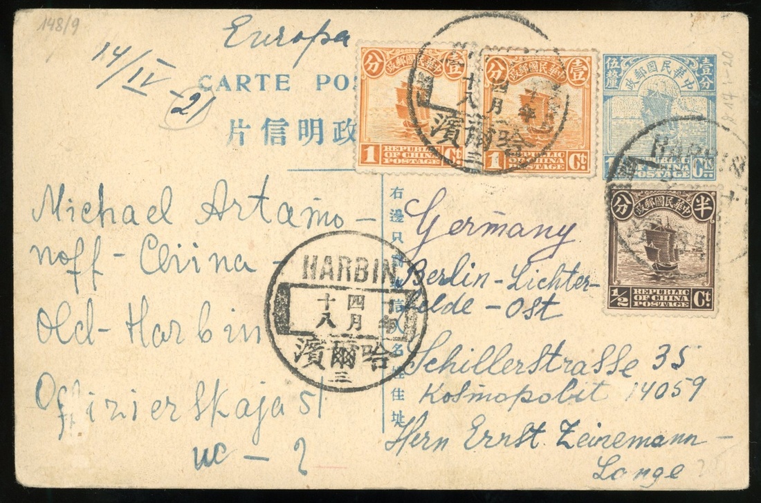 1921 (18 Apr.) 1½c. card to Germany, uprated ½c. and 1c.(2) Junk cancelled by Harbin bilingual c.d.s., fine.