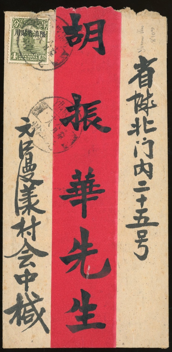 1927 (18 Aug.) red band cover to Kunming bearing Limited for use in Yunnan ovpt. Junk 4c. cancelled by Yuankiang bilingual c.d.s., showing unclear Yunnanfu arrival c.d.s on reverse, fine.