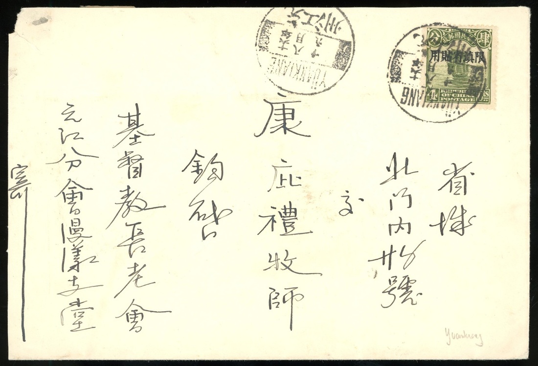 1927 (19 Aug.) envelope to Kunming bearing Limited for use in Yunnan ovpt. 4c. cancelled by Yuankiang bilingual c.d.s., showing Yunnanfu arrival c.d.s. (28.8) on reverse, fine.