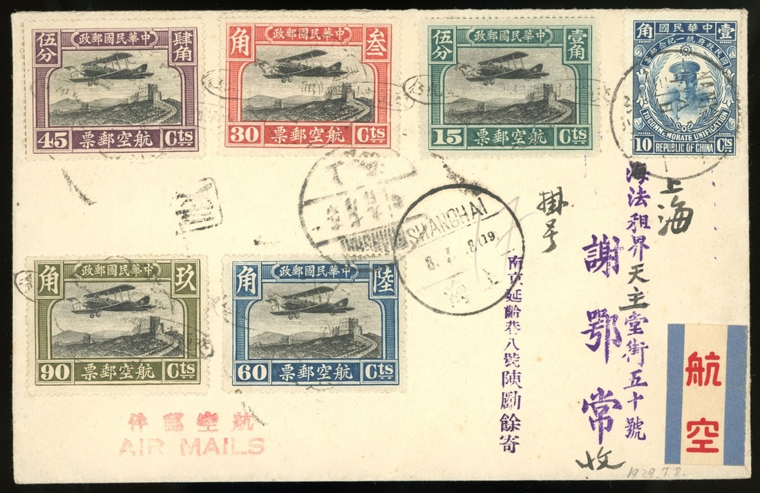 1930 (9 July) an air mail envelope from Shanghai to locally, bearing 2nd air mail complete set of 5 and Unification 10c, both tied by Shanghai c.d.s. fine