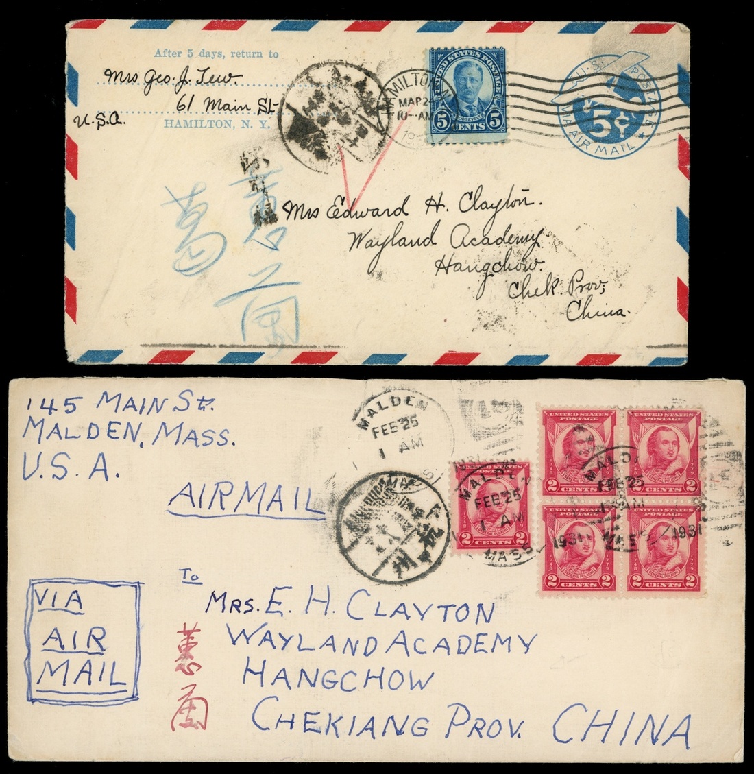 1930-31 a group of two covers from U.S.A. to Hangchow, both showing Shanghai transit c.d.s. and arrival c.d.s, fine.