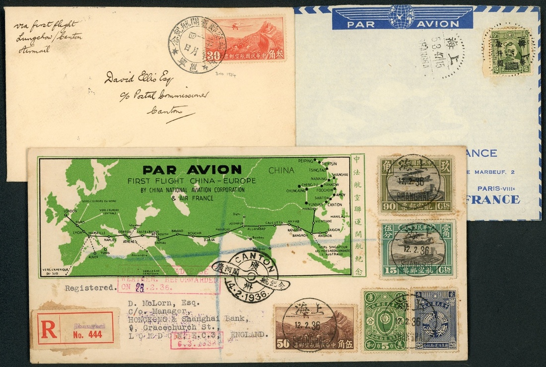 1934-47 a group of first flight covers (3) including 1934 (4 Oct.) Lungchow to Canton, 1936 (14 Feb.) Canton to Hanoi and 1947 Shanghai to Paris, fine group.