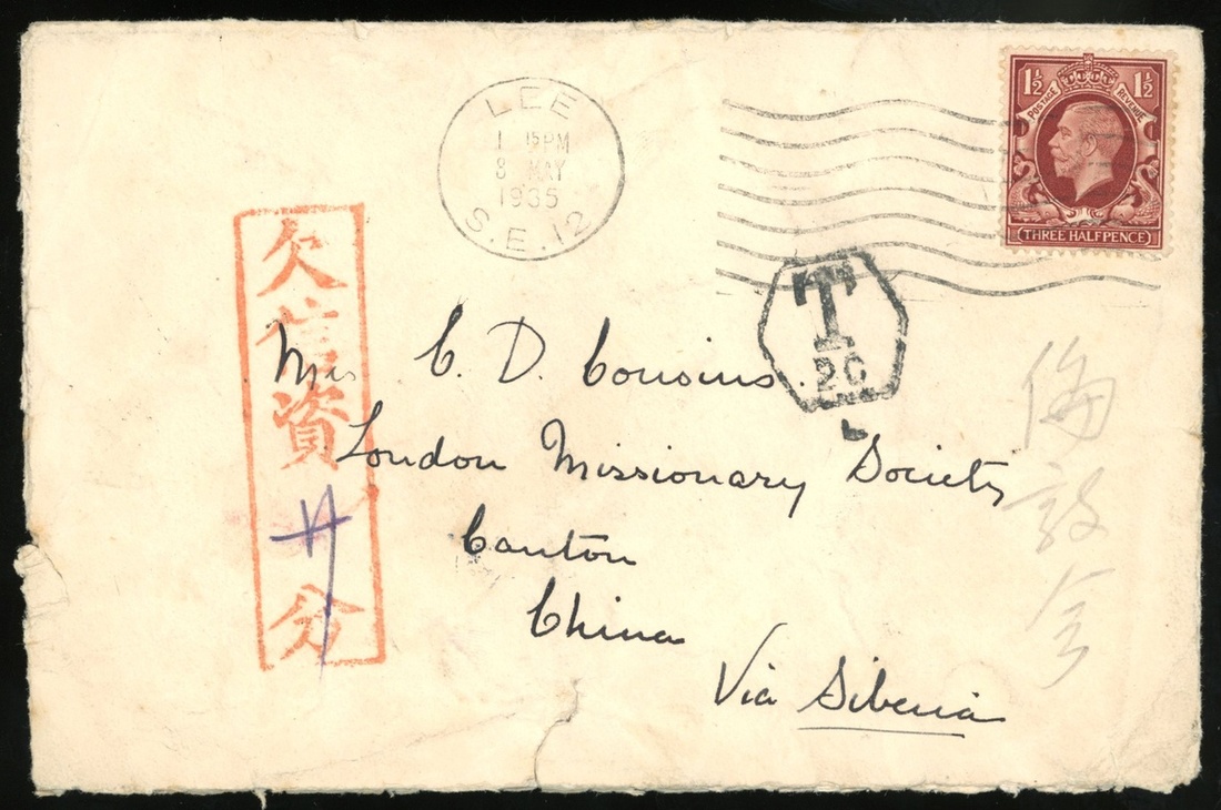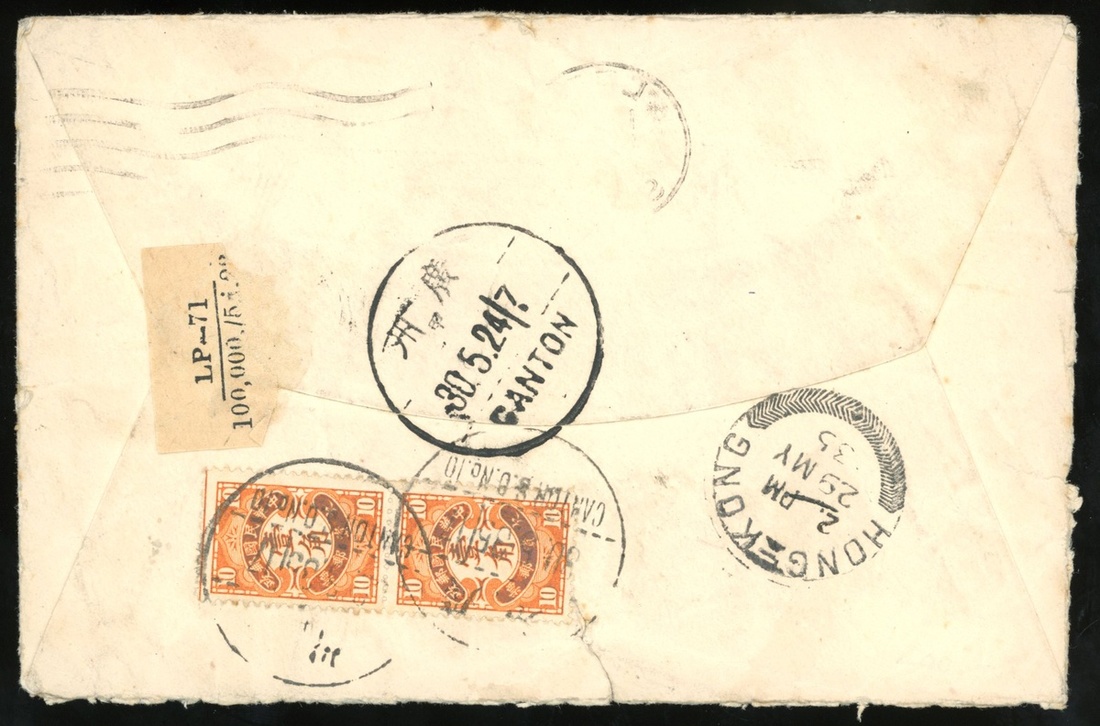 1935 (3 May) envelope from London to Canton via Hong Kong (29.5), bearing 1½p. cancelled by machine d.s., showing on front hexagoanl "T/2C" postage due h.s. in black and matching with rectangular h.s. "Postage due" in red with manuscript indication of 20c. Postage due. 10c. (2) postage due bearing on reverse cancelled by Canton c.d.s., with arrival c.d.s.(30.5) adjacent, fine