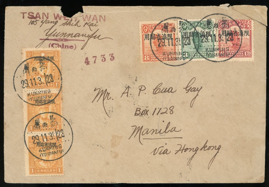 1935 (29 Nov.) envelope to Manila bearing Limited for use in Yunnan ovpt. Junk 3c., 6c., and 8c., and Martyrs 1c. vertical strip of three cancelled by Kunming bilingual c.d.s., showing various transit c.d.s. on reverse, fine.