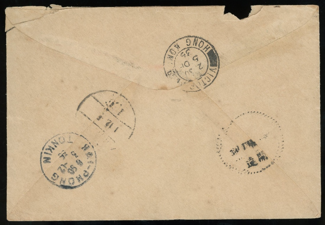 1935年昆明寄馬尼拉實寄封1件,貼北京二版帆船加蓋限滇省貼用3分6分8分各一枚,京版烈士加蓋限滇省貼用1分3枚,銷昆明11月29日戳,經開遠,河口,海防,香港中轉,有多地中轉戳,郵路清晰,保存完好