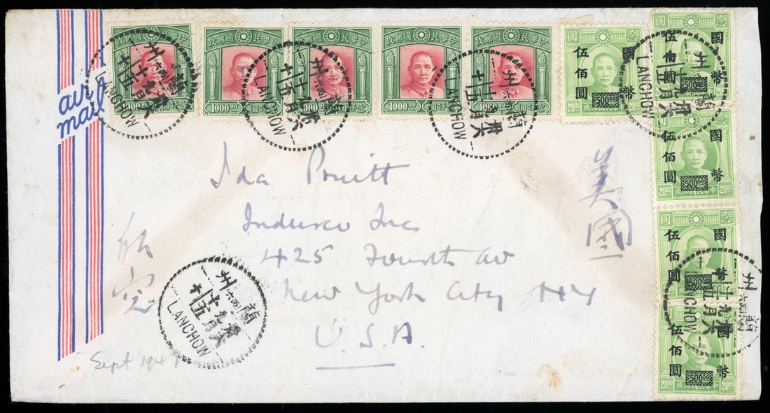 1947年蘭州寄美國航空封1件,貼倫敦四版孫像1000元5枚,孫像加蓋國幣500元5枚,銷蘭州9月15日戳,郵戳清晰,保存完好