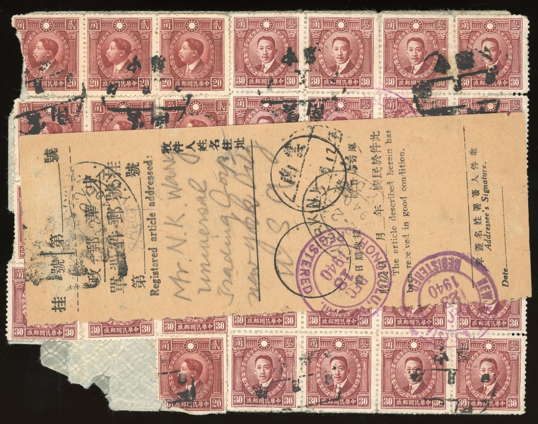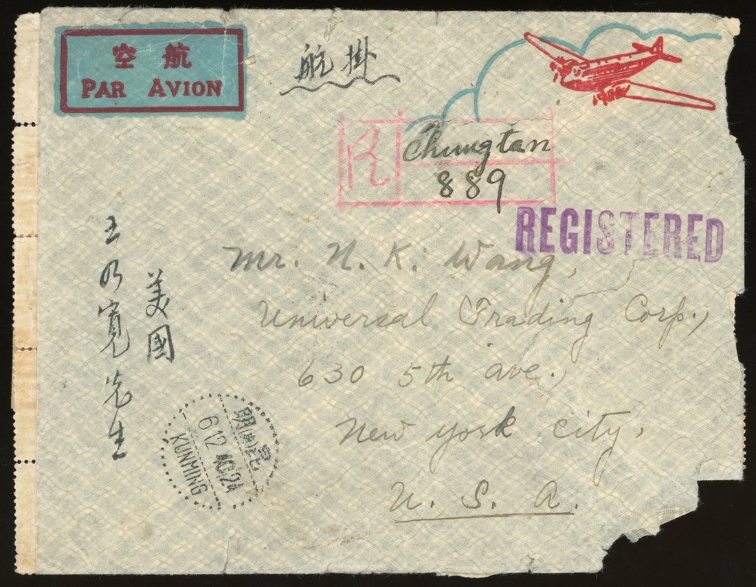 1940 (5 Dec.) airmail registered envelope to U.S.A. bearing on reverse Martyrs 30c.(23), 20c. (10), opening tear at right, some stamps missing when open, cancelled by Chungtan undated Chinese h.s. with hand fill date, matching with registration slip and framed h.s. in red on front, showing Kunming (6.12), Honolulu (18.12) transit c.d.s and arrival c.d.s. (22.12), fine.