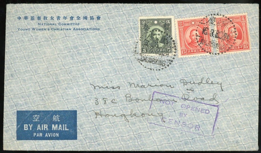 1941 (16 Mar.) airmail envelope to Hong Kong bearing Dr.S.Y.S. 3c. On 5c. and 15c.(2) cancelled by Chungking bilingual dotted rim c.d.s., showing framed "NOT OPENED BY CENSOR" h.s. in violet, fine.