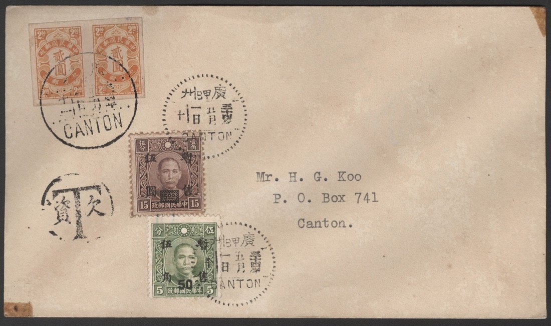 1941 (1 May) An envelope to local bearing 50c. on 5c. and $5 on 15c. tied by Canton c.d.s., showing circle "T" postage due h/s, pair imperf. $2 tied by Canton (1.5) c.d.s.