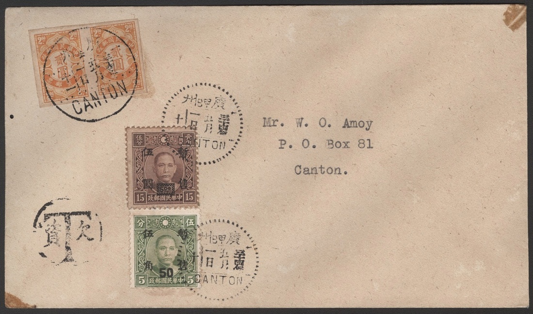 1941 (1 May) An envelope to local bearing 50c. on 5c. and $5 on 15c. tied by Canton c.d.s., showing circle "T" postage due h/s, pair imperf. $2 tied by Canton (1.5) c.d.s.