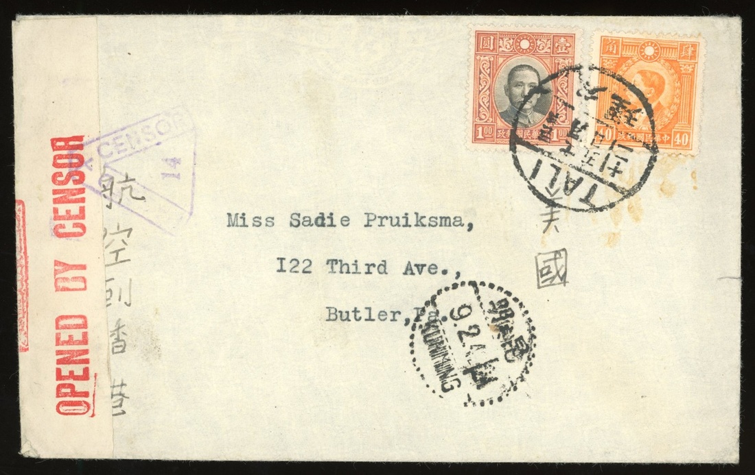1941 (5 Dec.) envelope to U.S.A. bearing Dr. S.Y.S. $1 and Martyrs 40c. cancelled by Tali bilingual c.d.s., showing next year Kunming (9.2.42) transit c.d.s., with censor seal and censor h,s, in violet, fine.