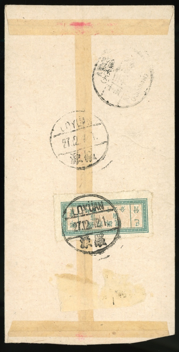 1942 (27 Dec.) a registered envelope to Foochow, bearing Domestic Registered Postage Paid green stamps, tied by Loyuan c.d.s.