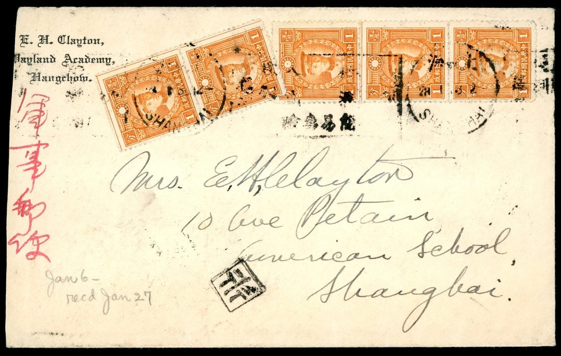 1943 (28 Jan.) local envelope to Shanghai bearing Martyrs 1c. (5) cancelled by machine d.s., showing on reverse square military h.s. in red, fine.