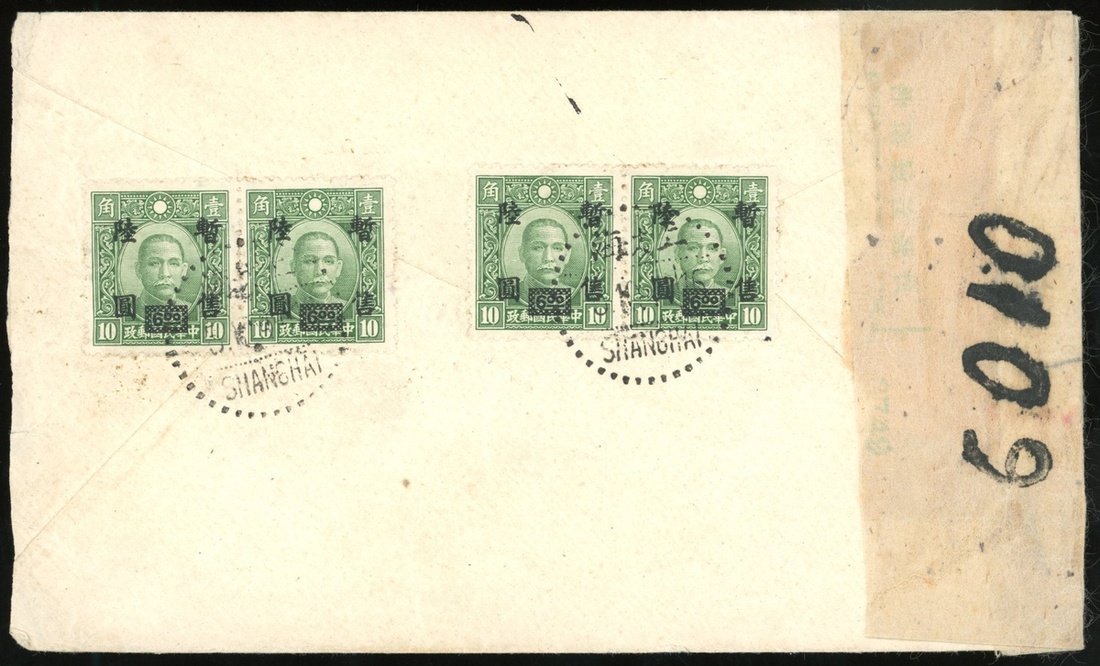 1943 (5 Oct.) express envelope to Kweiyang bearing on reverse Dr.S.Y.S. $6 (4) cancelled by Shanghai bilingual dotted rim c.d.s., with censor seal, fine.