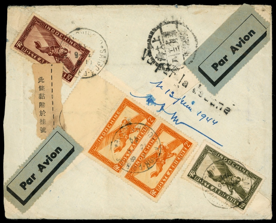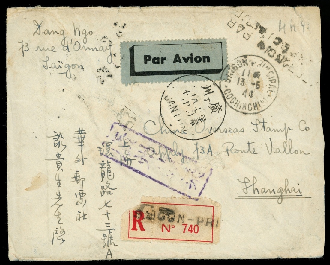 1944 (13 Jun.) incoming registered airmail to Shanghai bearing on reverse Indochines airmail stamps 10c., 39c., and $2 vertical pair cancelled by Saigon c.d.s., showing Canton transit c.d.s. (8.7) matching with framed h.s. mail instruction in Chinese and registration label No.740 adjacent, with arrival c.d.s. on reverse (13.7), fine.